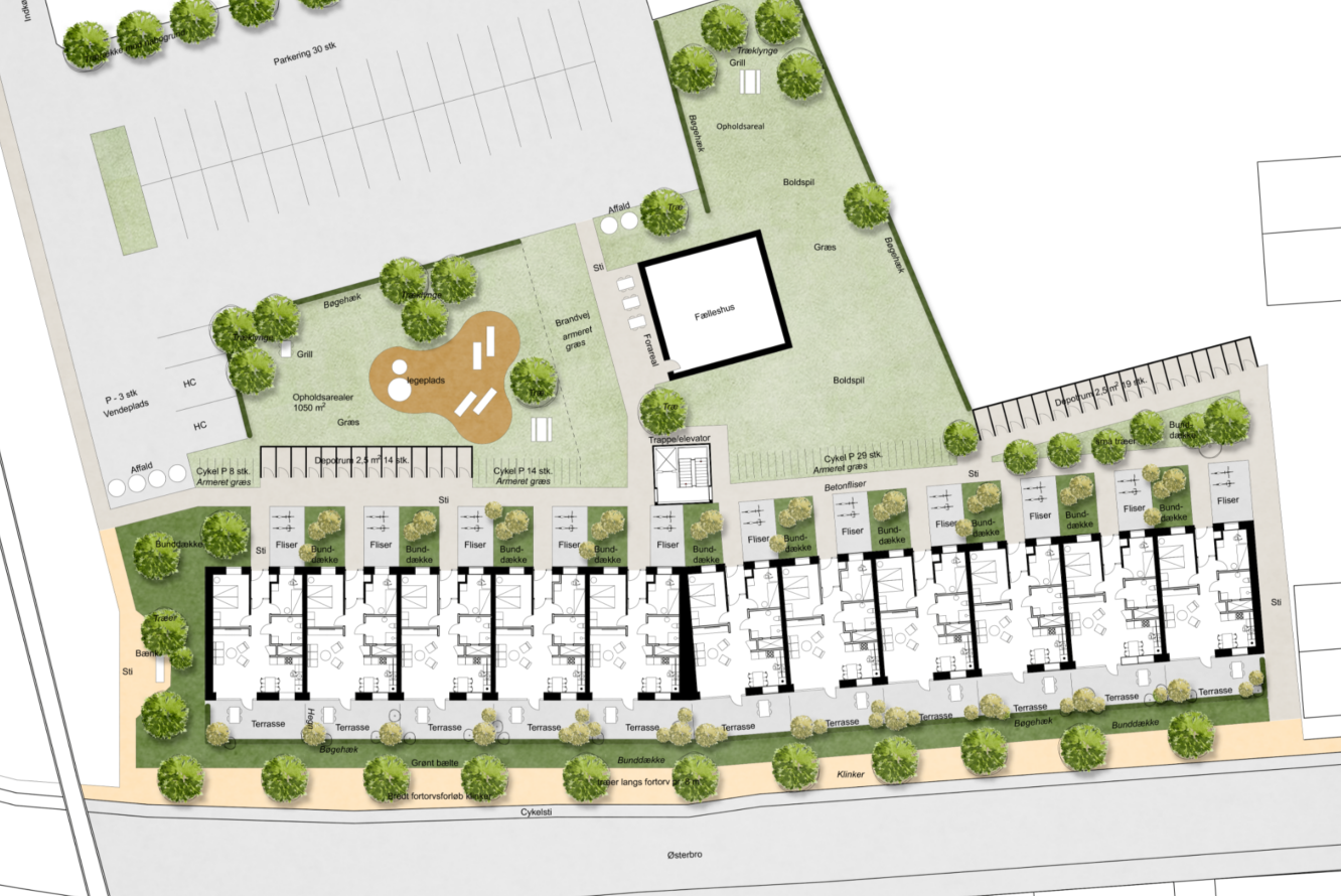Nedbrydning af eksisterende bygninger på flere matrikler, dom sammatrikuleres. Der opføres 33 boliger på mellem 70 og 89,9 m² som etagebyggeri i 3 etager med ankomst til boliger ved trappe- og elevator tårn til svalegange. Boligerne i stueetagen får egen have og boligerne på 1. og 2. sal får altan. Der vil være et uudnyttet tagrum. Boligerne får tilhørende depoter i terræn og der opføres et fælleshus på matriklen.