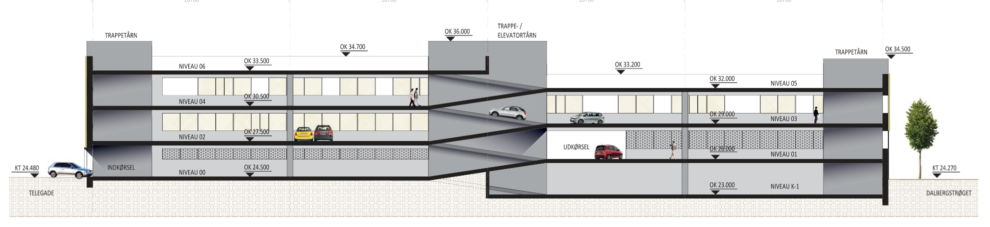 P-huset bliver bygget som et splitlevel parkeringshus bestående af seks niveauer. Det nederste niveau ligger delvist placeret under terræn. Der kommer til at være indkørsel via Telegade og udkørsel via Girostrøget. Dette gøres for at give det bedste trafik-flow og mindske kødannelser i og omkring P-huset.