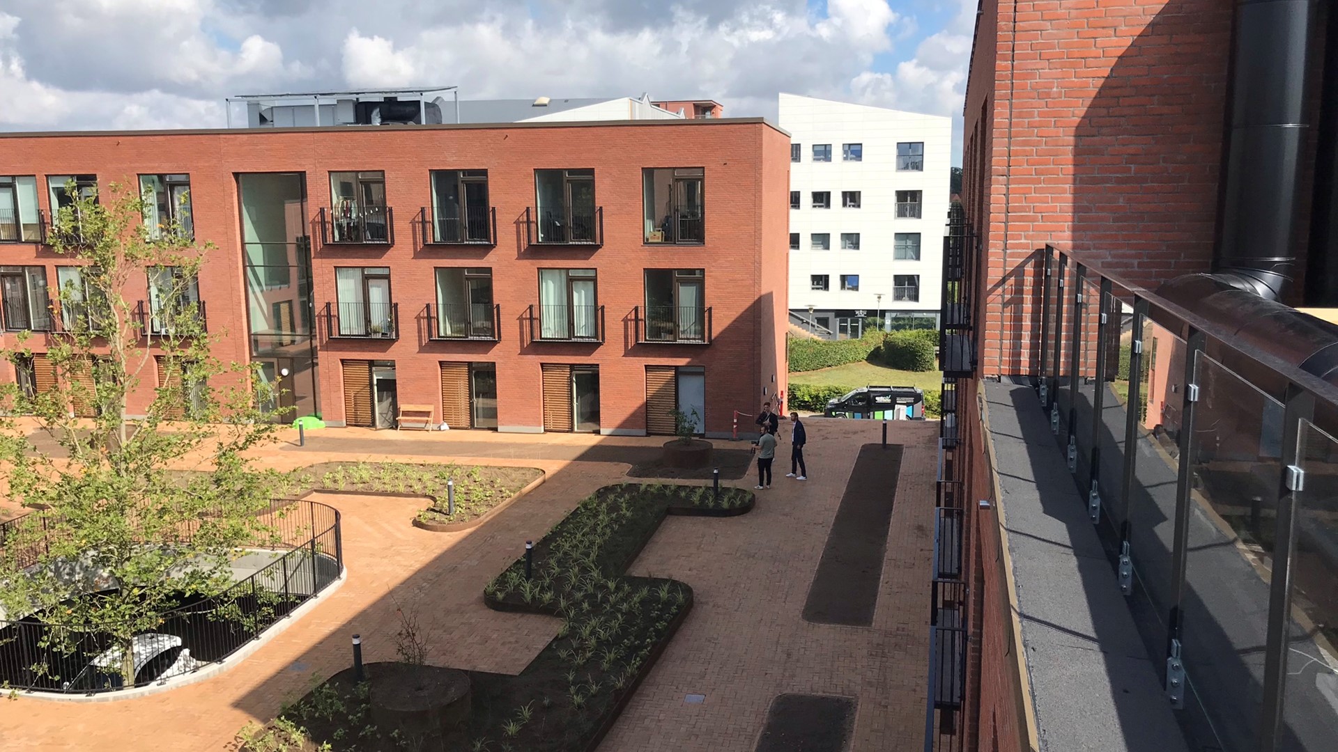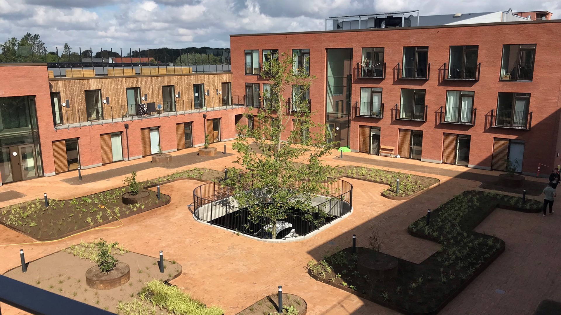 Under gårdarealet er der placeret kælder med parkeringsplads til 39 biler samt depoter og teknikrum. I gårdrummet er der mulighed for ophold i det grønne gårdrum.