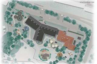 Projektet omfatter en tilbygning for udvidelse af daginstitutionen på 1.465 m² samt yderligere 380 m² fordelt på orangeri, krybberum, fælles grupperum og overdækkede terrasser samt et spændende udendørs miljø på legepladsen, parkeringsareal og udearealer.