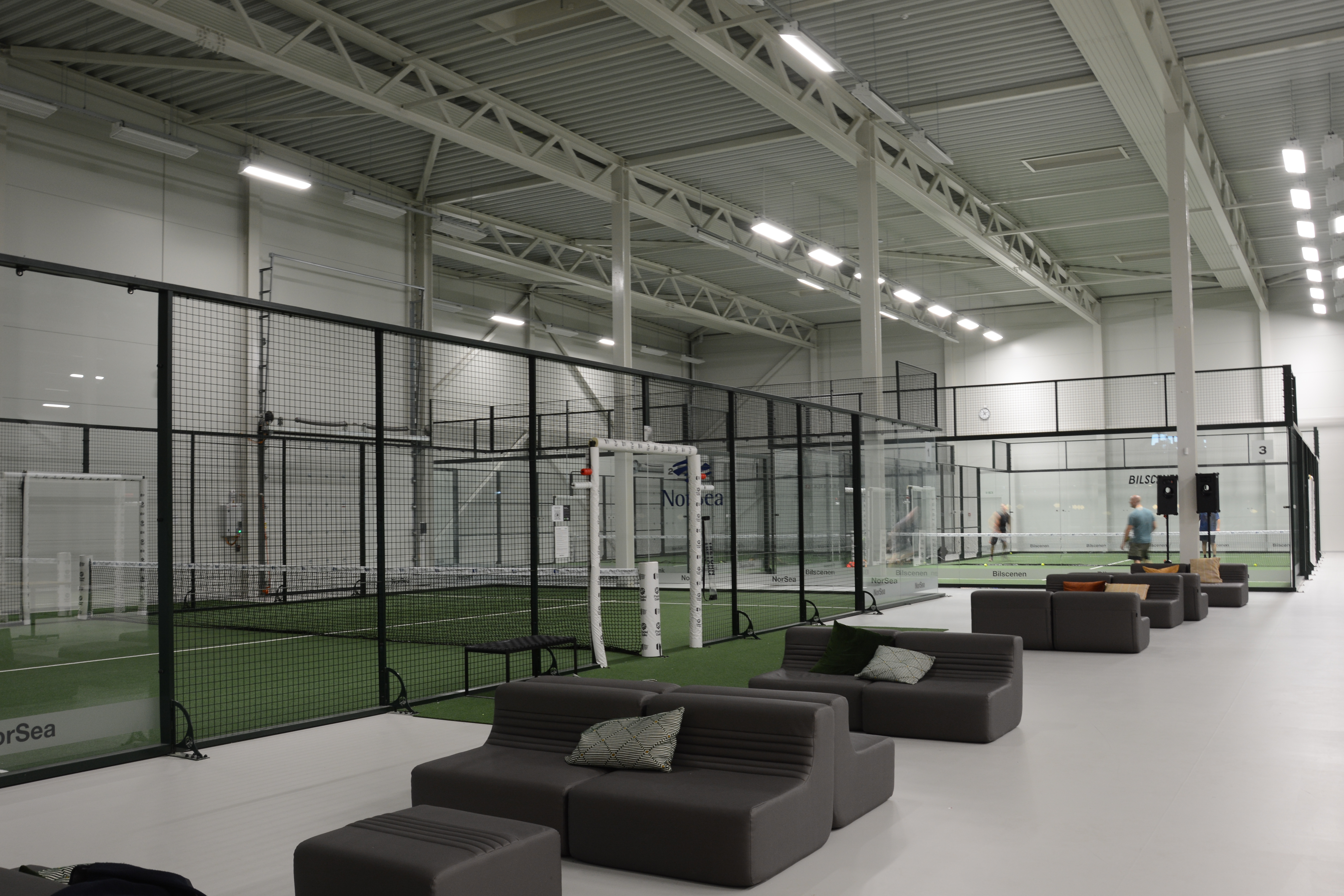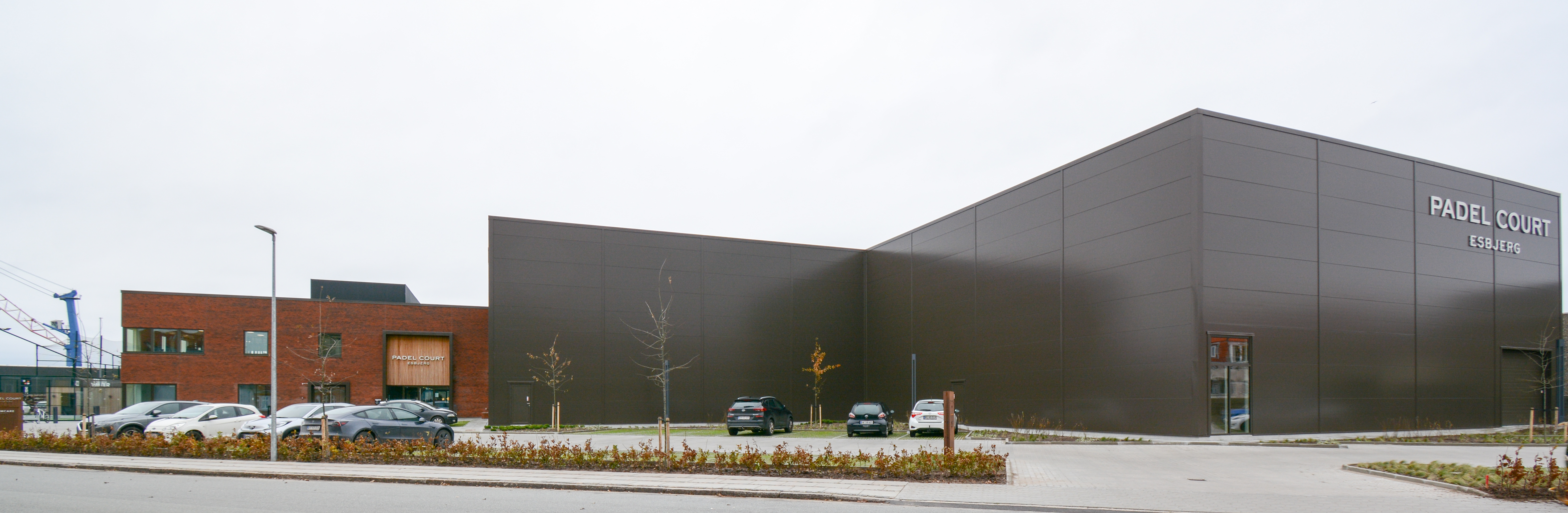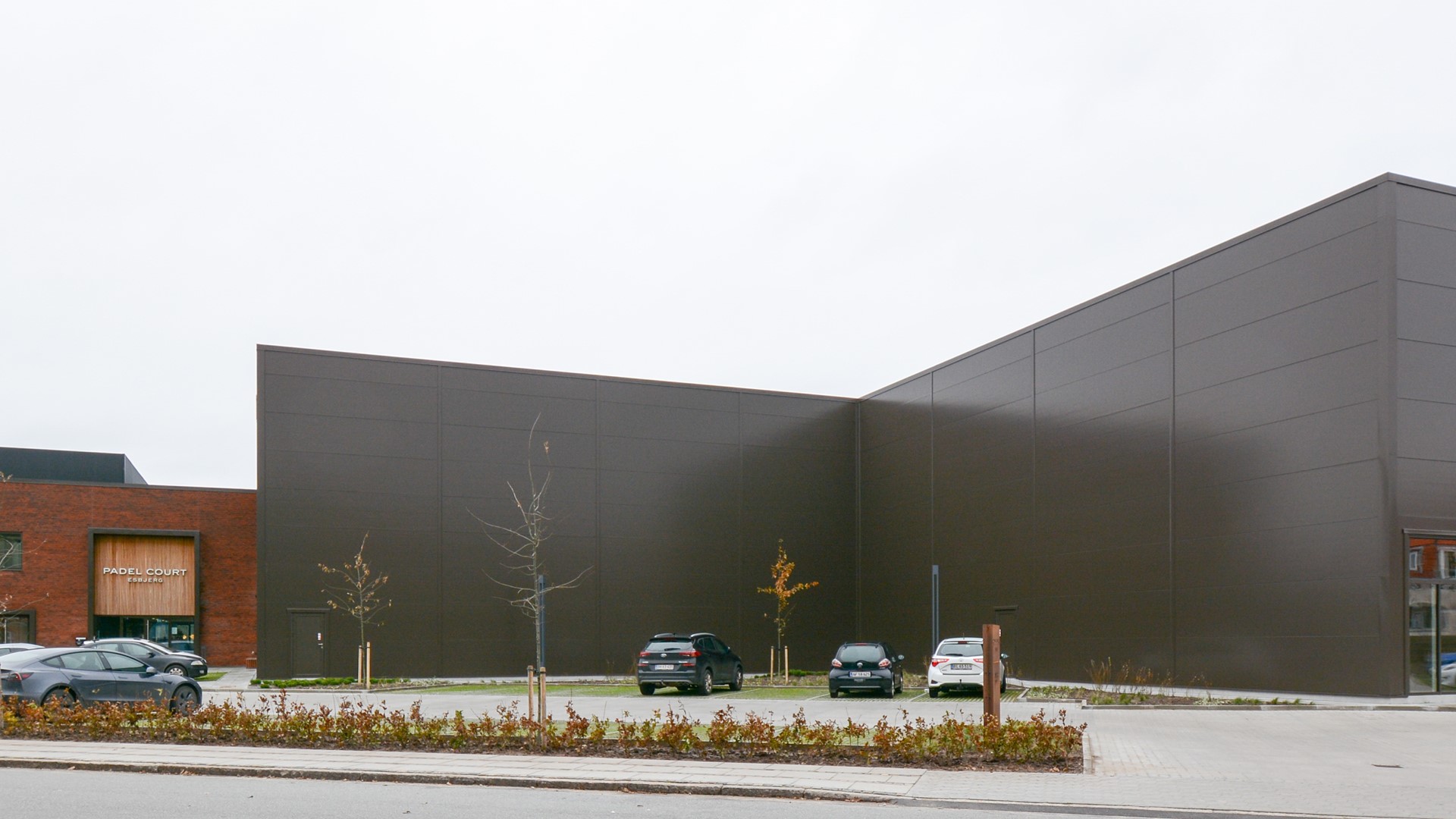 Padelhallen er udført med en bærende stålkonstruktion med ydervægge af sandwichpaneler og fladt tag med tagpap.
