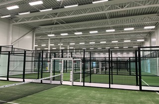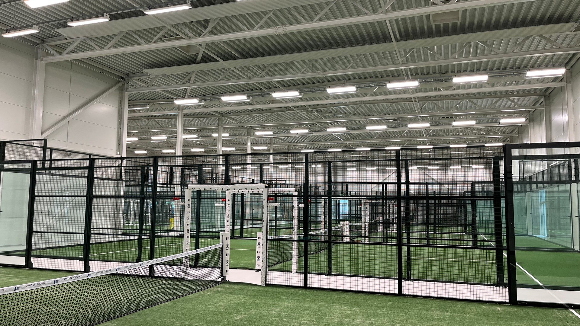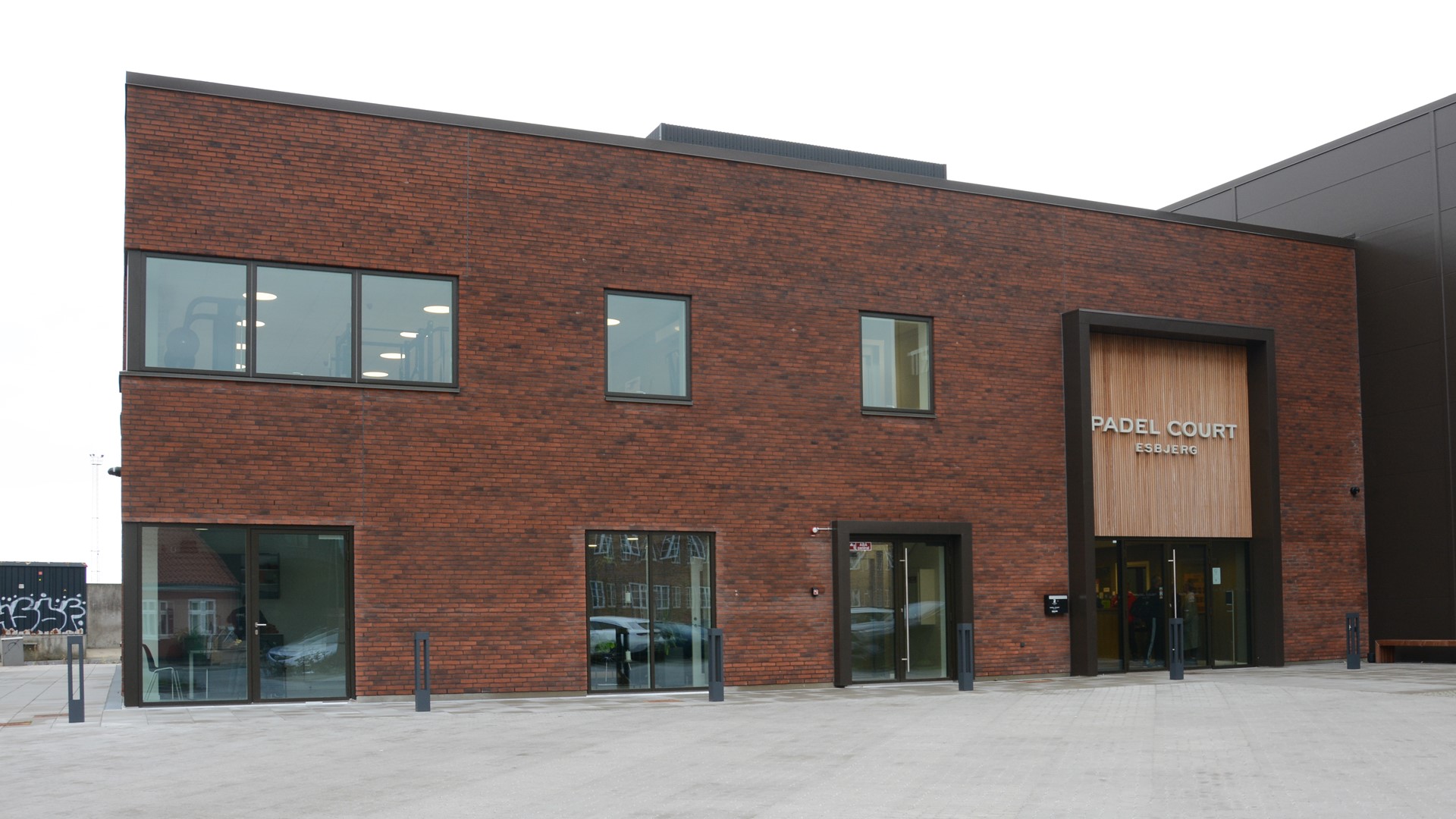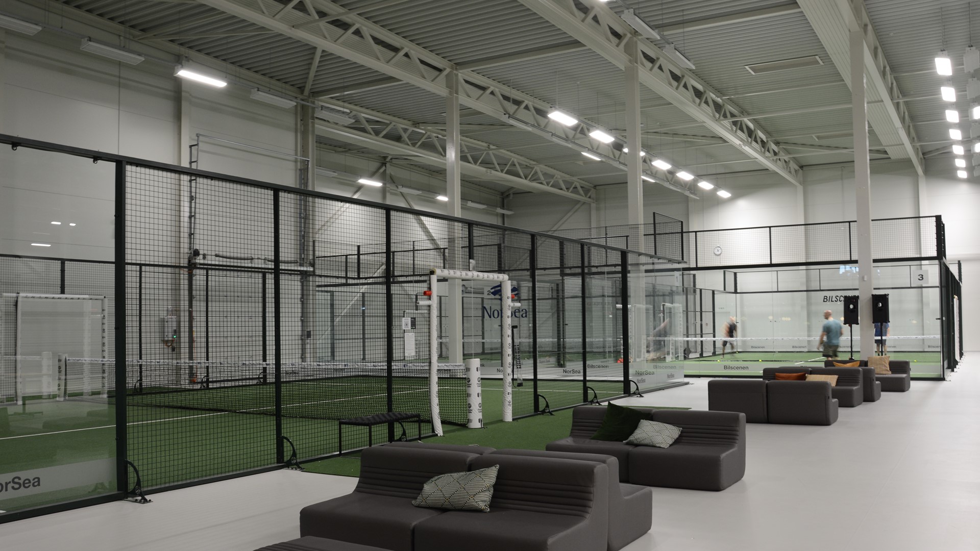 Padelhallen er udført med en bærende stålkonstruktion med ydervægge af sandwichpaneler og fladt tag med tagpap.