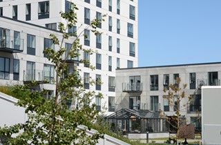 Sammensætningen af de forskellige niveauer bidrager til både at markere byggeriet på afstand og samtidig skabe et indre gårdrum omkranset af de lavere bygninger. Gårdmiljøet danner rammerne om grønne områder og stisystemer.