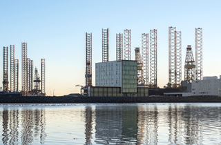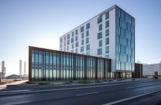 Byggeriet består af en lav del i to etager samt en høj del på otte etager. De to bygningskroppe skærer hinanden som et kors og den høje del udkrages mod den kommende lagune.