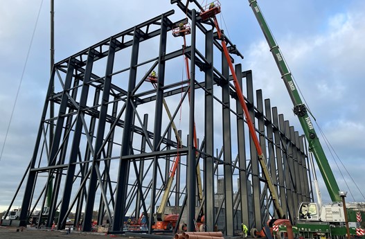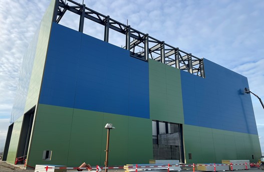 Samarbejdet tog fart, da stålkonstruktionerne og de aftagelige tagflader begyndte at stille særlige krav. Inde i hallen skal en traverskran kunne flytte de tunge komponenter på tværs, mens to store åbninger i taget giver adgang for montage og løft.