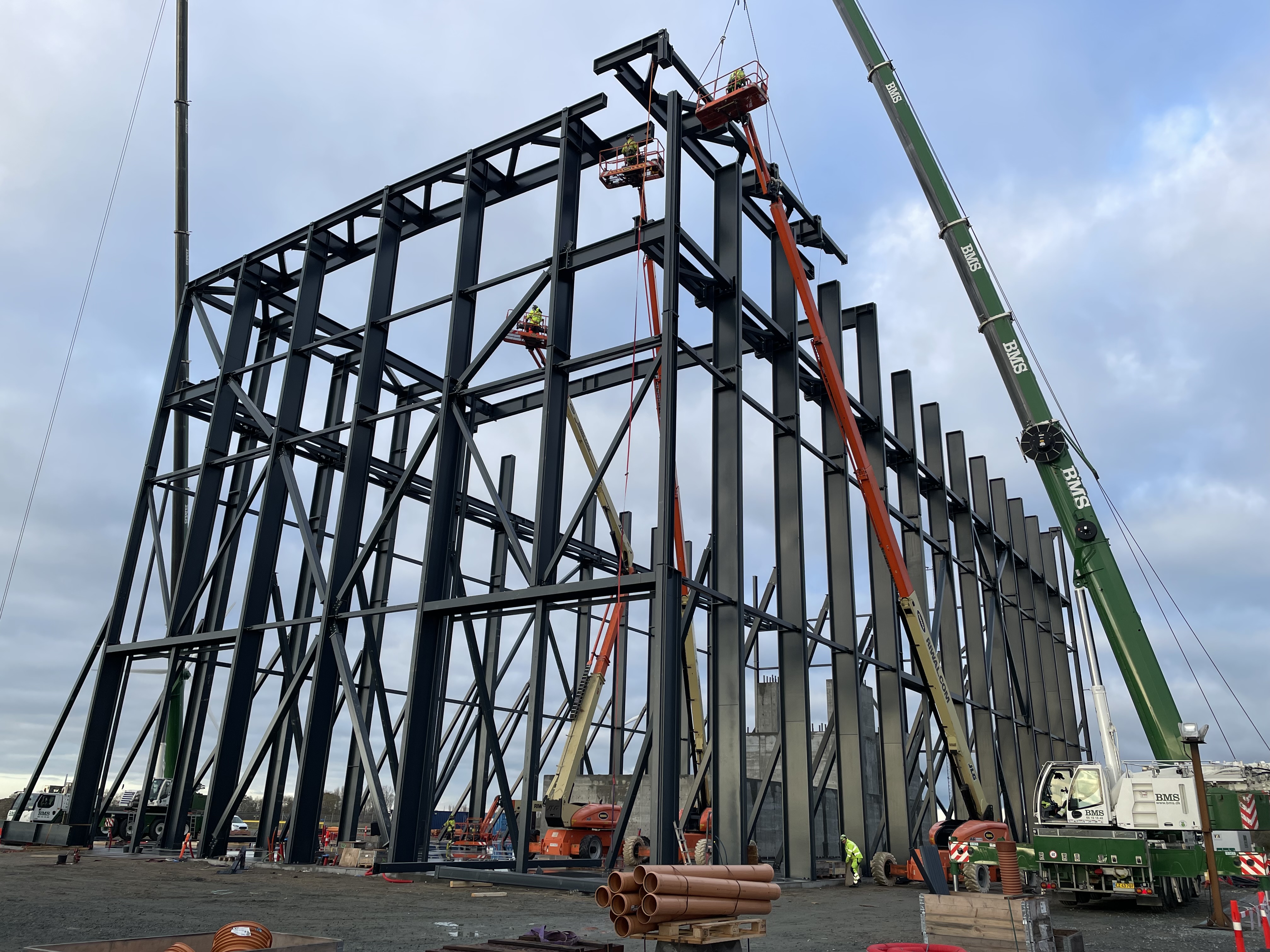 Samarbejdet tog fart, da stålkonstruktionerne og de aftagelige tagflader begyndte at stille særlige krav. Inde i hallen skal en traverskran kunne flytte de tunge komponenter på tværs, mens to store åbninger i taget giver adgang for montage og løft.
